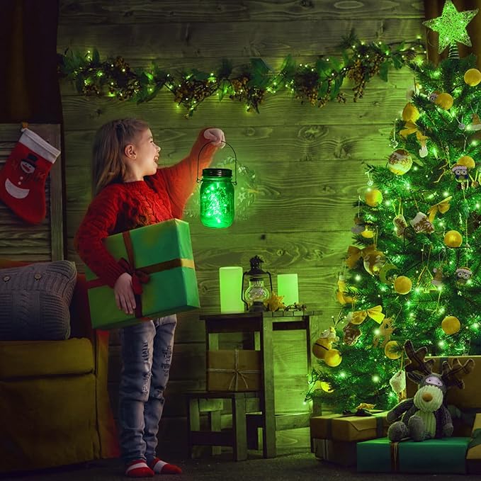 - Mason Jar Solar Lights for Outside - Made of 30 green bright LED beads twisted into silver wire, 100% powered by solar panels, the lid is an aluminum structure, and 12 stainless steel handles help you easily hang the assembled mason jar lights on thinner branches, fences, walls and porches, very convenient