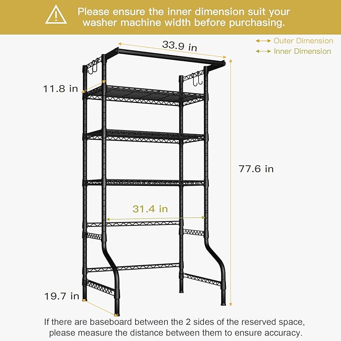 - [Size Details]: Whole product dimension: 33.9"W x 19.7"D x 77.6"H, wire shelf size: 33.9"W x 11.8"D, shelf inner width for washer and dryer is 31.4 inches