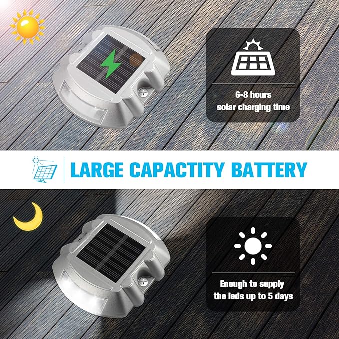 - 【Solar Powered】Eco-Friendly Rechargeable solar panels,automatically recharges during the day and glows when night falls.Each light has 6 leds which gives out Intensityt and steady light.we could have called these Deck Dots, Stair Dots, Pier Dots or Boardwalk Dots