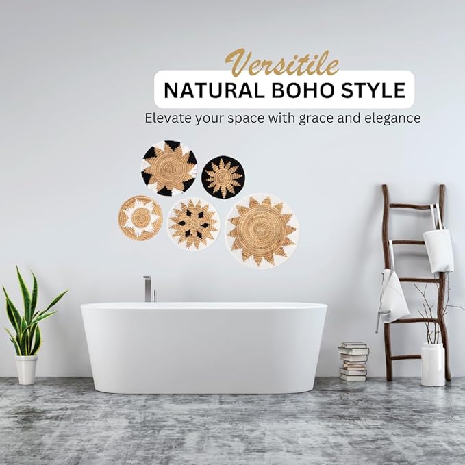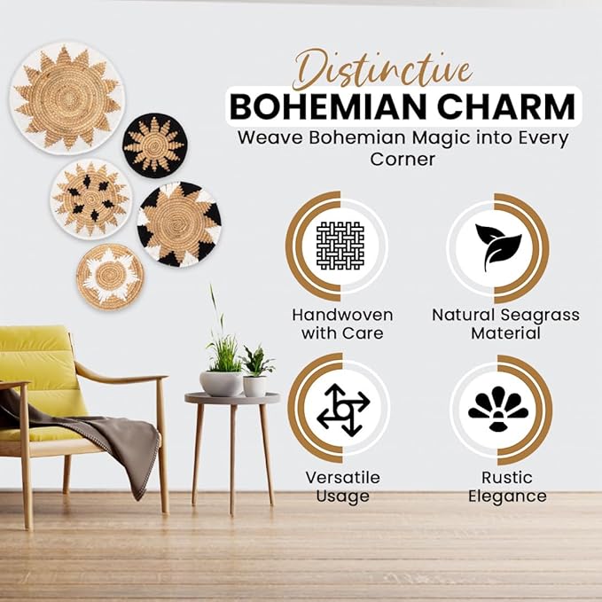 Tebie At Home Boho Wall Art - Boho Wall Baskets Decor - Handmade Set of 5 Woven Baskets With Seagrass - Flat Elegant Art for Farmhouse and Rattan Decor for Living Room, Bedroom and Office