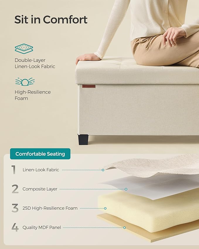 SONGMICS Storage Ottoman Bench, Foldable Foot Rest with Legs, 15 x 43 x 15.7 Inches, End of Bed Bench, Storage Chest, Load up to 660 lb, for Living Room, Bedroom, Entryway, Cream White ULSF018W01