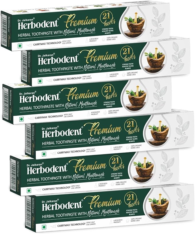 Herbodent® Premium Toothpaste -5.82 Oz Pack of 6 | 21 Herbs for Strong Teeth & Healthy Gums-Neem, Clove, Cinnamon, Cardamom with Natural Mouthwash-No Paraben, No Fluoride, No Saccharin, No Triclosan