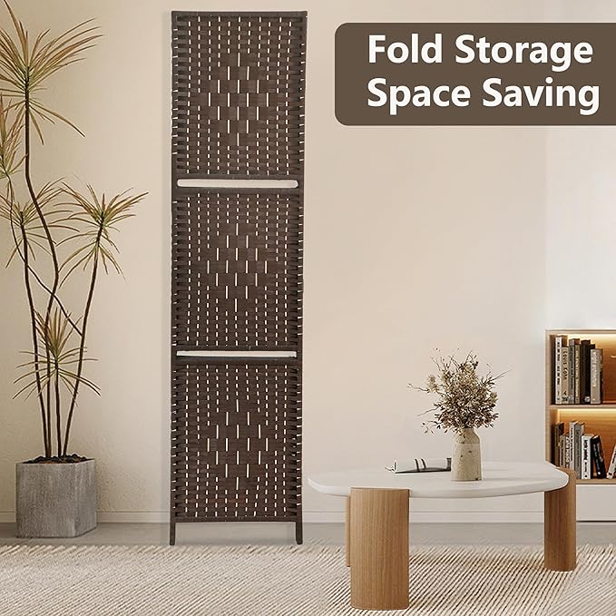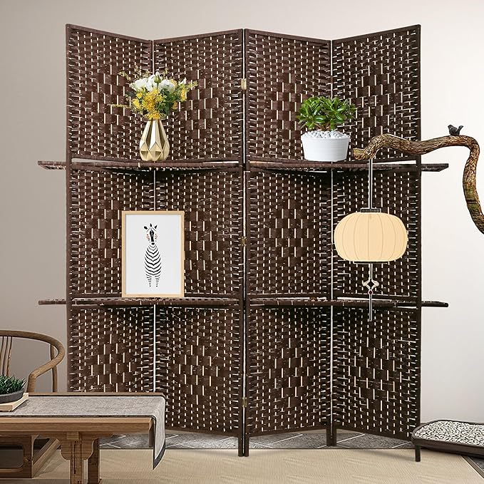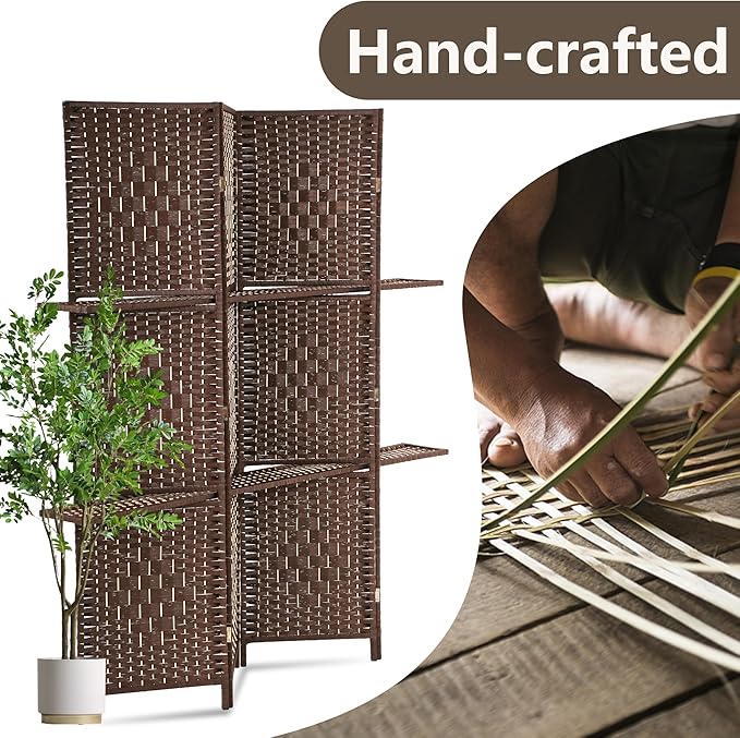 PayLessHere Room Divider 4 Panel Room Screen Divider Wooden Screen Folding Portable Partition Screen Wood with Removable Storage Shelves Color, Brown