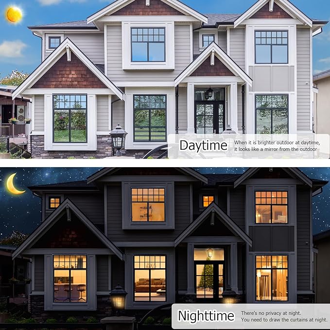 - DAYTIME WINDOW PRIVACY FILM: Attention about the privacy of one way window film, there is different privacy effect between daytime and night. When the outdoor light is stronger than indoor at daytime, the reflective window film provides a mirror effect, you can see out no one can see in. Note: When the inside light is stronger than the outside at night, the mirror effect will be reversed, people outside can see inside. Do remember to draw the curtain at night.