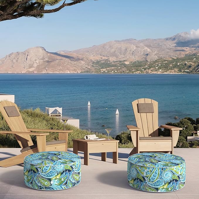 Inflatable Ottoman Stool D21 xH9 for Outdoor/Indoor Use, Water Repellent Patio Foot Rest with Portable Handle,Round Pouf Ottoman Suitable for Garden,Deck and Camping - Paisley Lapis Green