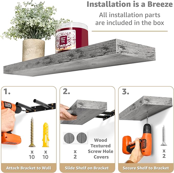 - Versatile & Functional Floating Wall Shelves: Install these floating shelves in the bedroom or bathroom to hold beauty/hair products - Place your wall shelf under a mirror in the entryway or exhibit family photos gallery style in a long hallway - Use as bathroom shelf, book shelf for wall, wall decor for bedroom, over the toilet shelf, kitchen floating shelves, floating nightstand, kitchen decor, living room wall decor, display shelf, and more