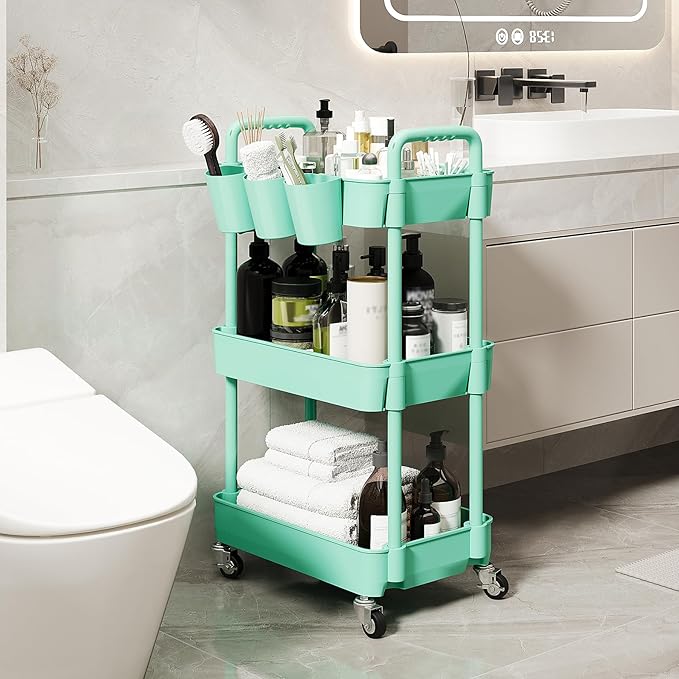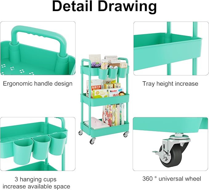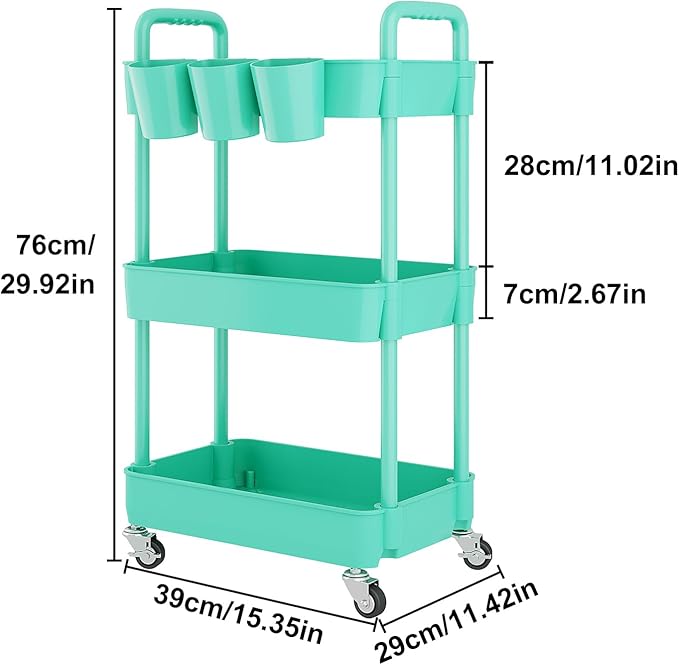 UDEAR 3-Tier Rolling Utility Cart,Multifunctional Storage Shelves with Handle and Lockable Wheels for Room,Office,Kitchen,Bathroom,with 3 Hanging Cups,Green