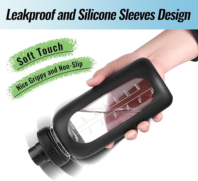 • WIDE MOUTH WATER BOTTLE: our 64 oz glass water bottle makes you easy to add ice cubes, tea bags, juicing or smoothies, also easy to clean it, food-grade silicone sleeve adds the glass tumbler a soft touch, nicely grippy and non-slip, it will be your perfect everyday companion