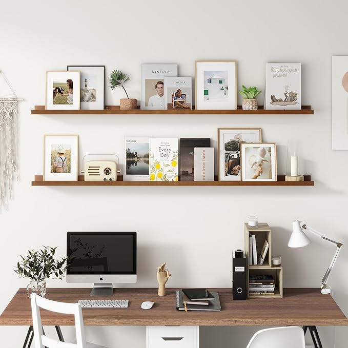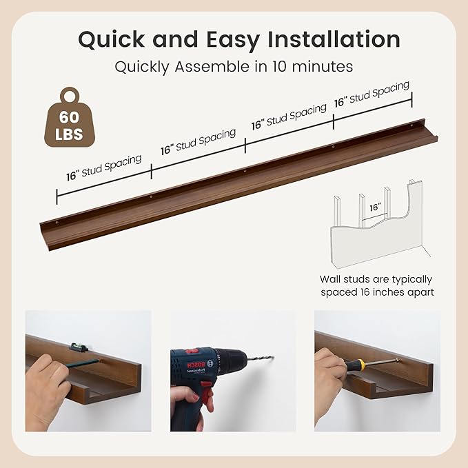 - Easy to Install: You will get a level, screws for the wall, drywall anchors, a detailed installation guide, and two beautiful hand-crafted solid pine wood shelves. With the level, you can make sure your picture ledge shelves are well aligned. Just follow the simple instruction to install the hanging shelves for wall decor within 10 minutes. We add additional screw and anchor to the hardware bag just in case. If you have any questions about our products, please feel free to contact us