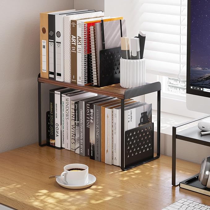 Mitus Shelf Organizer and Storage, Tiered Wood Cabinet Rack for The Kitchen Counter, Bathroom Counter, Pantry Cupboard, Office Desk Bookshelf, 12" Wide Walnut Brown and Black (Large)