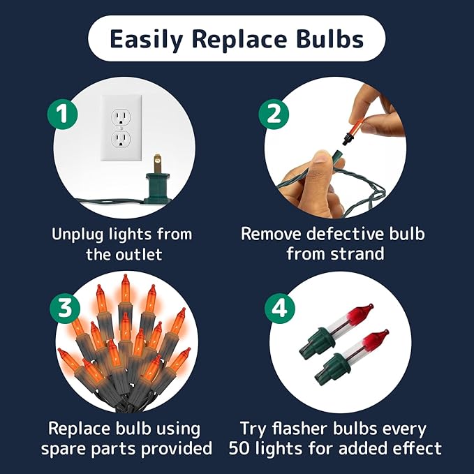 - LIGHTS FOR MAGICAL EFFECTS: Orange halloween lights indoor set includes 4 flasher bulbs per 50 bulbs to create a twinkling effect. Swap a regular bulb with a flasher bulb to enjoy a festive atmosphere