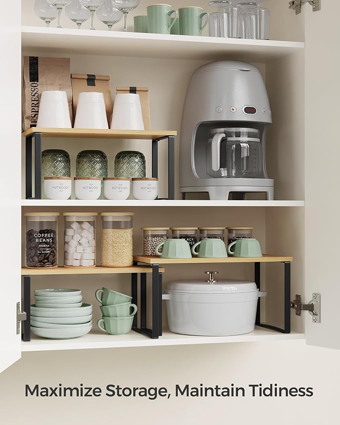 SONGMICS Cabinet Organizer Shelf, Set of 3 Kitchen Counter Shelves, Kitchen Storage, Spice Rack, Stackable, Expandable, Ink Black and Natural Beige UKCS014B01