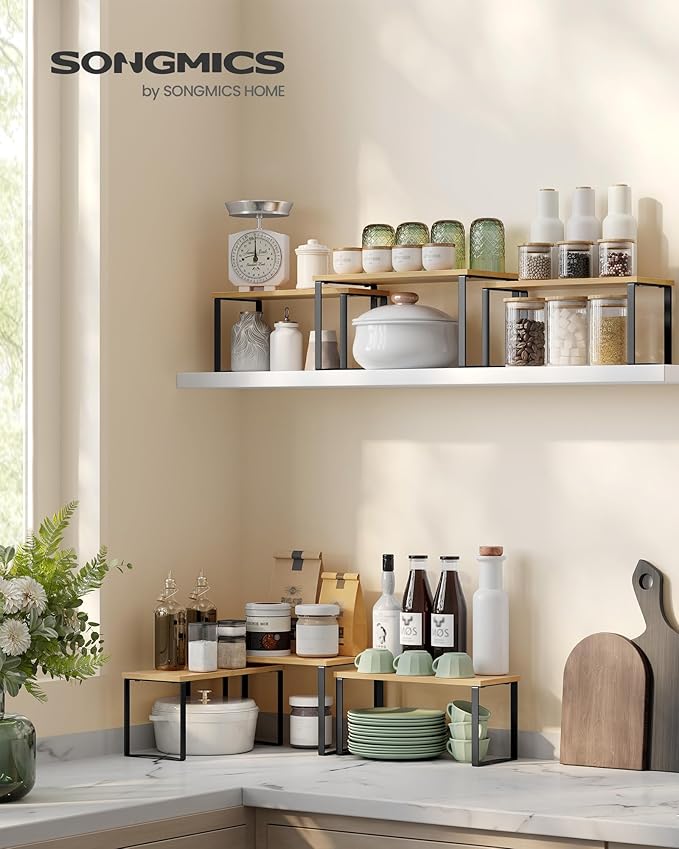 - 【MULTIPURPOSE USE】Not just for the kitchen! Use these kitchen counter shelves to elevate your dining table centerpiece in the restaurant, organize makeup on your bedroom desk, or store toiletries in the bathroom