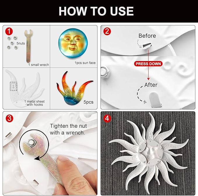 - 【Easy to Install】The metal sun wall decoration comes with a sturdy metal hook, making it easy to install on the wall or ceiling. You can easily install it in a few minutes according to the installation instructions we provide.