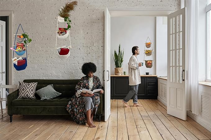 - 【3-IN-1 Large Capacity Design】 These beautiful macrame hanging wall baskets feature three separate tiers, including 3 hanging baskets of different sizes. Separate storage allows you to easily classify your items and keep your living space tidy. With a large storage capacity, 3 tier hanging fruit basket is very suitable for wall hanging to store or organize various items.