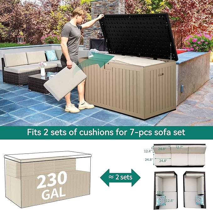 - Large 230-Gallon Capacity: The patio storage box measures 62.2"L x 31.1"W x 32.6"H, spacious enough to store various items such as cushions, tools, supplies