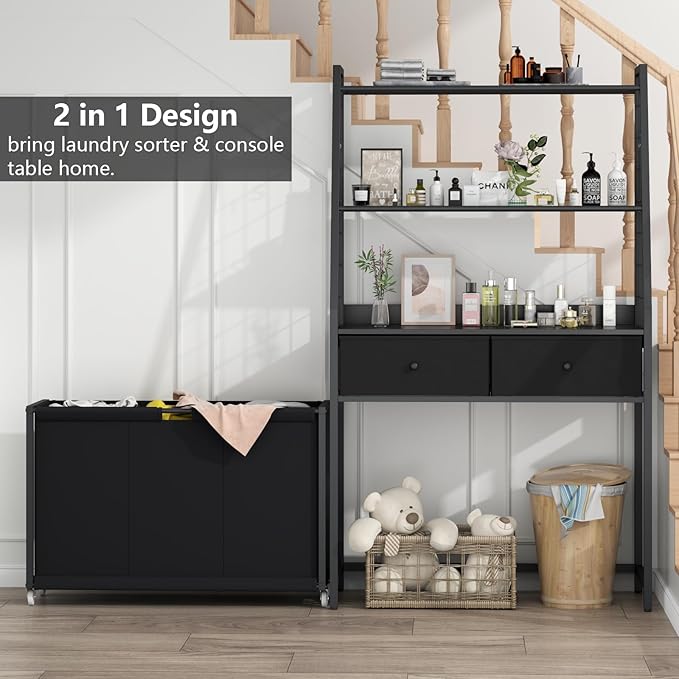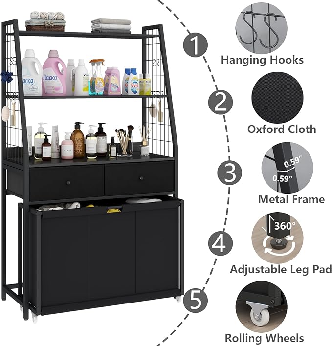 - [Easy Assemble & Reliable Construction] The entire laundry hamper consist of two pieces which are respectively console table with drawers and rolling laundry bags. Both of them utilized powder-coated steel tube as structure, especially the laundry basket choose round tube to reduce wear and tear on fabric. The package comes with clear assembly instructions and numbered parts, you will get a rolling laundry hamper in 30 Minutes.