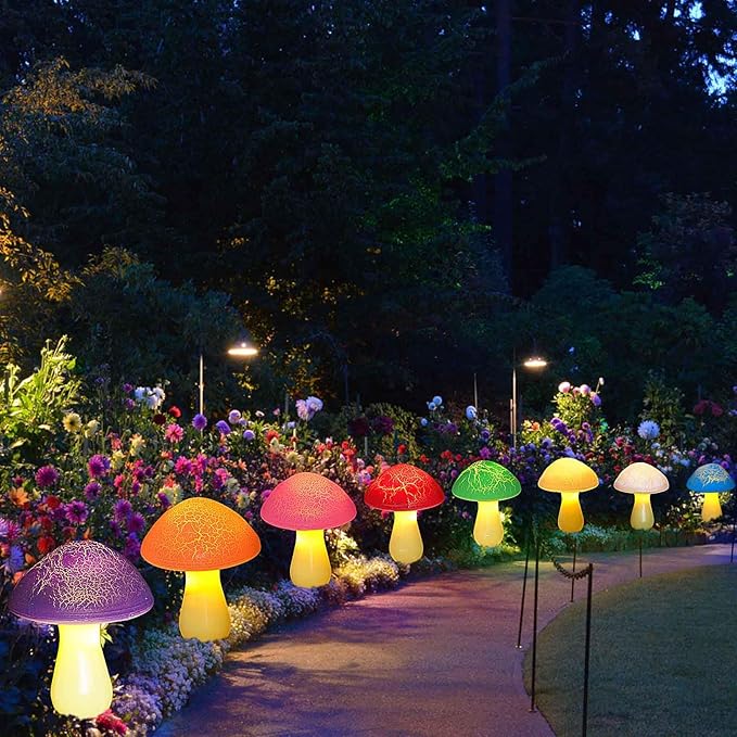 - 8 Colors & 8 Lighting Effects: 8 pcs Mushrooms, 8 bright colors, including red, yellow, white, blue, green, purple, pink, orange. 8 Lighting modes available, fun for patio party. These fairy mushrooms will make your garden yard stand out.