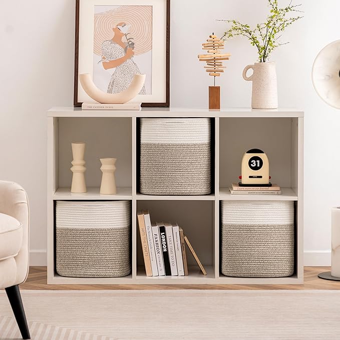 joybest Cube Storage Bins Set of 4, 11inch Cube Baskets Organizer for Nursery, Square Cotton Rope Baskets for Shelves Organizing, Kids Toy, Closet Storage, Brown and Cream White