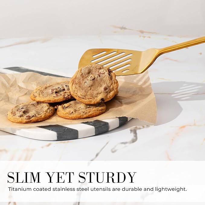 - ✔ YOUR STYLE IS A REFLECTION OF YOU; EVEN ON YOUR COUNTERTOP - Stylish and beautifully crafted you won't want to hide these gold kitchen utensils in a drawer. Go ahead and save drawer space by either hanging them on a utensil holder, wall or place these stainless steel cooking and serving utensils in a utensil canister.