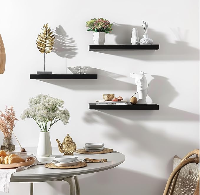 Wood Floating Shelves for Wall Decor, Rustic Wall Shelves for Bedroom Bathroom Kitchen Living Room, Set of 6 Black