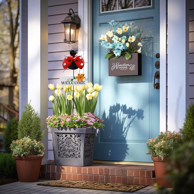 - DETAILED GARDEN DECOR: Metal ladybug garden stake is hand painted with vivid red colors and decorated with flower and welcome sign. The garden stake decor will definitely be an eye catching garden decor. The garden decor insect is connected to the stems by springs, when the breeze blows, it will nod or shake head and look lifelike.