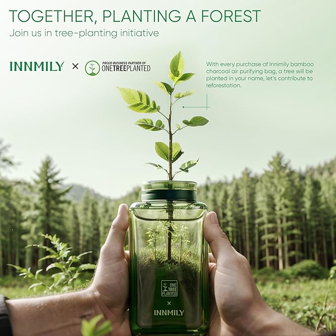 - TOGETHER, PLANTING A FOREST - We invite you to join us in tree-planting initiative - every purchase of Innimily bamboo charcoal air purifying bag, a tree will be planted in your name, let’s contribute to reforestation, aligning your well-being with environmental responsibility. natural solution that not only captures odors but also contributes to sustainability. Innmily home deodorizer bring fresh air, we offer no question asked money-back guarantee, if you were not satisfied with the smoke absorber