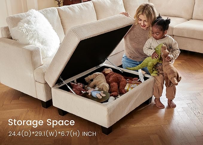 - Sectional couch with storage: This sectional couch includes a large storage ottoman, storage size size is 29.1 x 24.4"x 6.7 inches, great for storing toys, blankets, books, and keeping the area neat