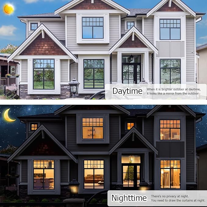 - ๐DAYTIME WINDOW PRIVACY FILM๐: Attention about the privacy of one way window film, there is different privacy effect between daytime and night. When the outdoor light is stronger than indoor at daytime, the reflective window film provides a mirror effect, you can see out and no one can see in. Note: When the inside light is stronger than the outside at night, the mirror effect will be reversed, people outside can see inside. โDo remember to draw the curtain at nightโ