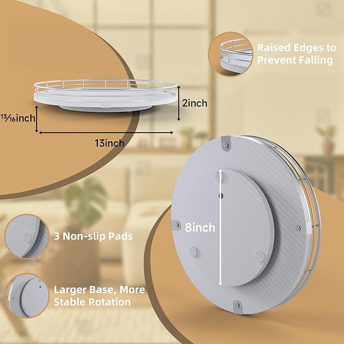 - Thoughtful Design - The raised edges are made of iron, which is sturdy and prevents items from falling off the turntable. The base is large enough and equipped with 3 anti-slip pads, the rotation is smoother and prevents scratches. No installation required, easy to use