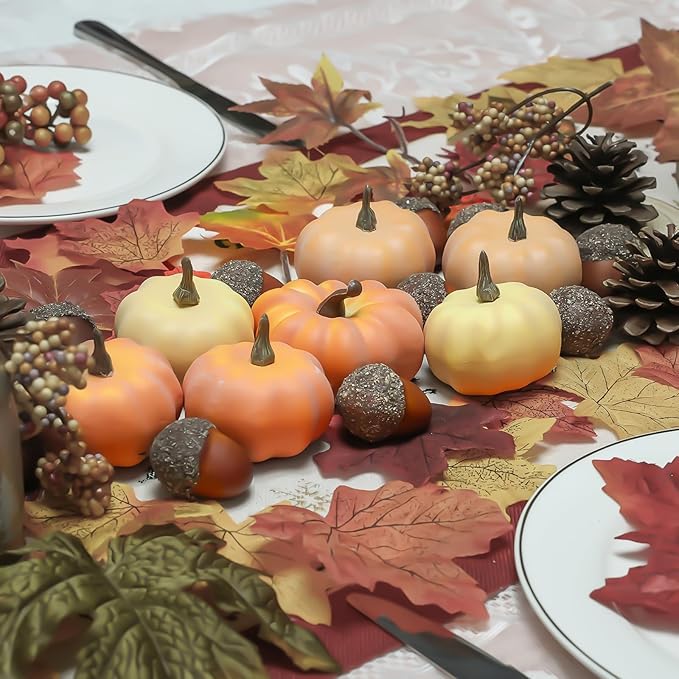 21Pcs Fake Pumpkins Fall Thanksgiving Decorations,Plastic Pumpkins with Acorns,Maple Leaves,Artificial Mini Pumpkin Decorating Autumn Harvest Outdoor Indoor Home Decor Centerpiece Table Decorations