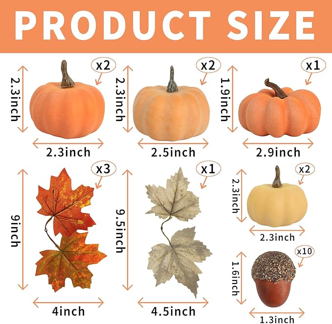 - 【Fall Decorations for Home】 - This fake pumpkins for decorating set includes 21 pcs ( 7 pcs lifelike artificial pumpkins, 10 pcs realistic acorns, 4 pcs realistic fall maple leaves ), artificial vegatables small pumpkins, and the beautiful Fall decor colors is very suitable for Harvest and Thanksgiving decor theme, especially thanksgiving table decor, fall party decorations, creating full fall sense for home decor