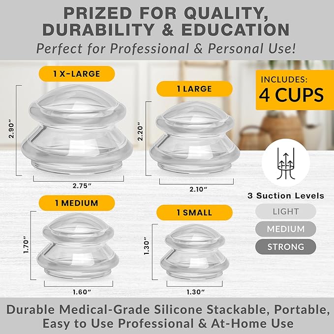 - Your EDGE cupping set includes 4 cups: 1 Extra-large (2.75"), 1 Large (2.10"), 1 Medium (1.60"), and 1 Small (1.30"). This range ensures optimal coverage for all body areas, muscles and joints. Perfect for myofascial release, lymphatic drainage, cellulite massage and muscle recovery.