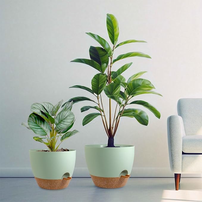 10/9/8 inch Self Watering Pots, Planter, Plant Pots with Mesh Drainage Holes for Indoor Outdoor Garden Plants, Plastic Flower Pots with Deep Reservoir for House Plants, Green with Brown