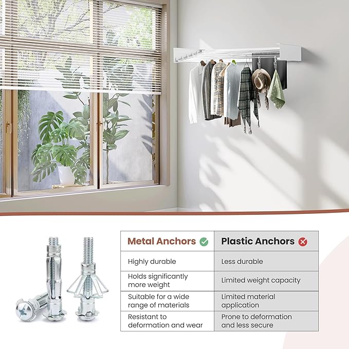 - Foldable Space-Saver – Sleek wall-mounted drying rack folds flat against the wall when not in use, freeing up floor space in laundry rooms, patios, or balconies.