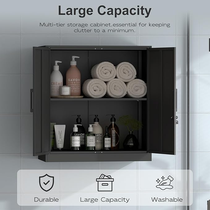 Metal Wall Cabinet,Garage Wall Cabinetwith Handle,Lockable Storage Cabinets Wall Mounted with 2 Doors,Locking Cabinet with Shelves for Basement,Living Home,Black