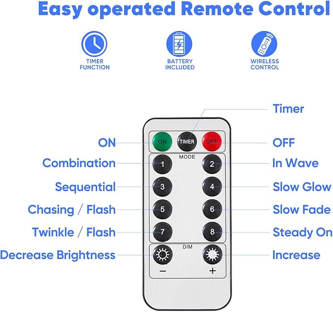 - Remote Control Convenience: Easily switch between 8 unique lighting modes and adjust brightness with the included remote; features timer for automatic 6 hours on, 18 hours off cycle.