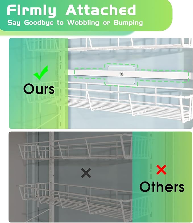 - Adjustable & Wall-Mounted: This over the door organizer can be adjusted to accommodate items of different heights. You can easily nail this rack to your wall or door for a secure and sturdy fit. The rack also features 4 adhesive stickers, which help to prevent swinging when opening and closing doors. The full basket design also ensures that your items won't slide off the back of the rack.