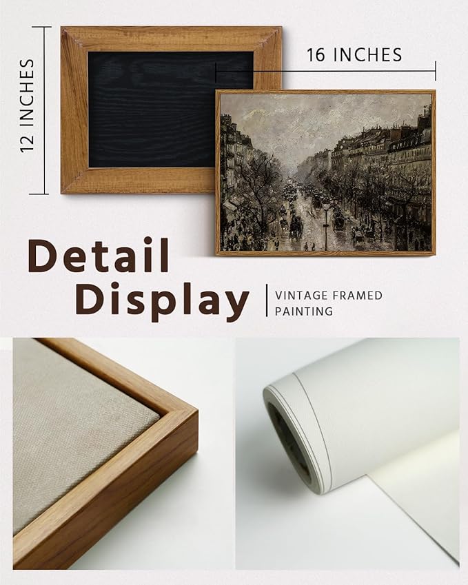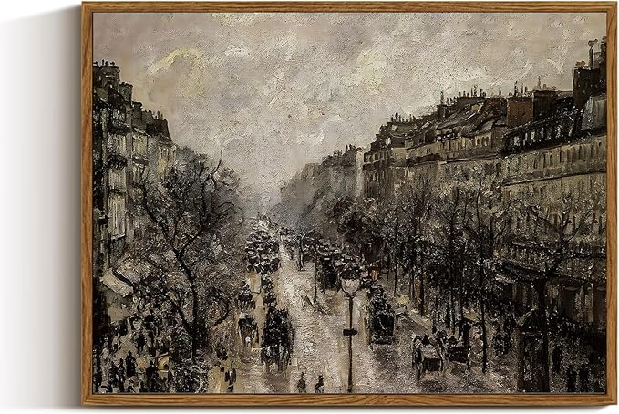 - VINTAGE FRAMED WALL ART DECOR: This painting, "Boulevard Montmartre à Paris" is the work of 19th century French artist Camille Pissarro. This work captures wall art decor not just a Parisian street, but a moment in time, alive with movement and the charm of city life in the rain. This vintage landscape painting can add more classic and elegant elements to your space.
