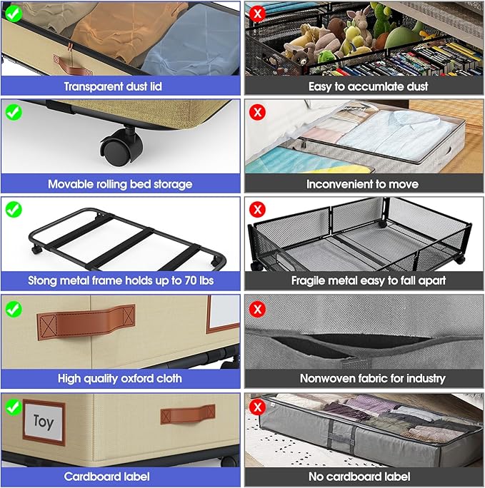 - 【Versatile storage containers】Designed to save space, helping to store seasonal clothing, bedding, shoes, books, toys decorations under bed, tall shelves, dresser, couch, desk, crib or other small nooks.The under bed storage containers perfect for families and college dorms that need extra storage space.