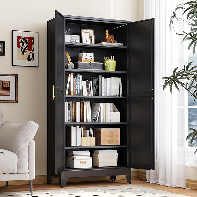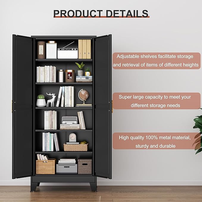 - 【High Quality Material】: The metal pantry cabinet are made of heavy gauge cold-rolled steel plate to resists chipping, rust, corrosion, long lifespan, sturdy and durable.Anti-rust,corrosion-resistant, easy to clean, odorless. Beside, we use the environmentally friendly paint to ensure safety for using the cabinet without any irritating odors and easier maintenance.