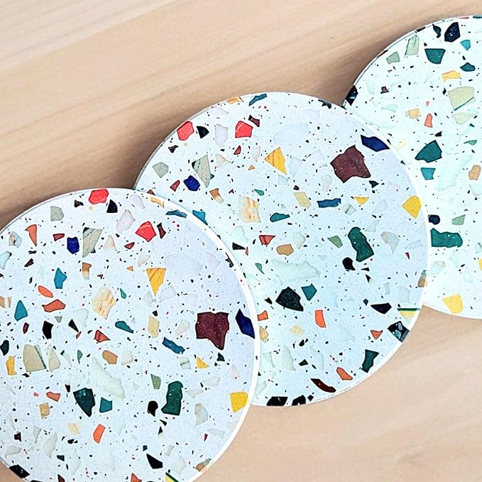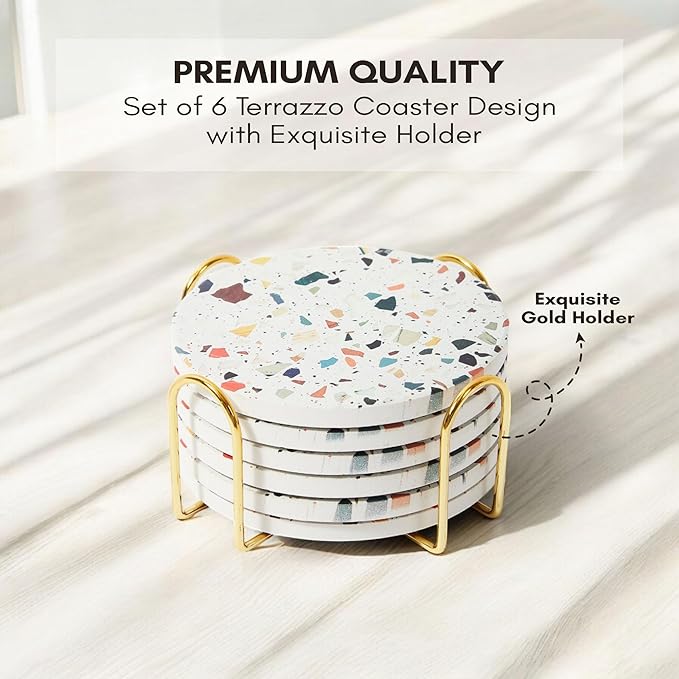 Terrazzo Drink Absorbent Coasters with Holder Set of 6, Ceramic Coaster for Drinks, Coffee Table Decor, Water Absorbing Stone Coaster for Drinks (Mosaic)