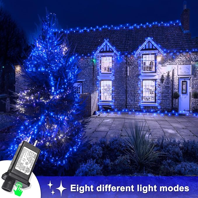- Waterproof Fairy Lights Plug in: The blue Christmas lights design with IP44 outdoor waterproof, can withstand wind, snow, rain and extreme weather. String lights are equipped with a UL certified 29V low-voltage plug ensures the safety. It's safe for family with kids or pets!