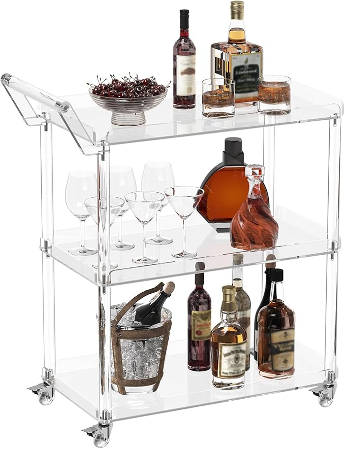 HMYHUM Acrylic Bar Cart with 4 Lockable Wheels, 30.5" L x 15.2" W x 34.5" H, Rolling Serving Cart for The Home Bar, Kitchen, Living Room, with Pulling Handle, Modern, 3-Tier, Clear