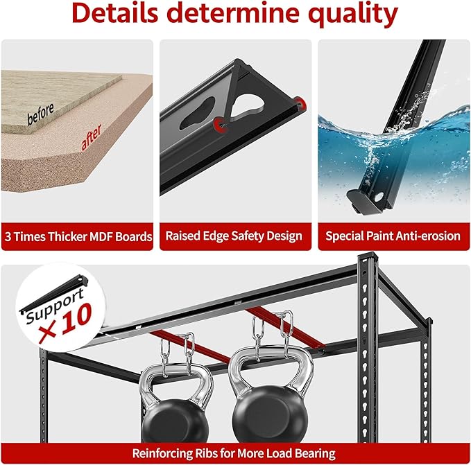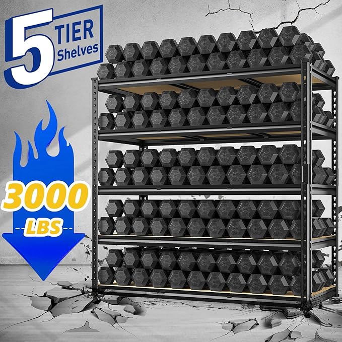 - 【3000LBS Capacity & 10 Support Ribs Garage Shelving】Garage shelving is made of heavy duty metal. We have 2 support rods under each layer of MDF for this storage shelves, which can further increase the load bearing to meet ur needs for placing heavy objects. The thickened single-layer load-bearing capacity 600LBS and the total load-bearing capacity of 3000LBS. It is suitable for garage, workplaces, living room, kitchen, to store camping equipment, tools, kitchen supplies