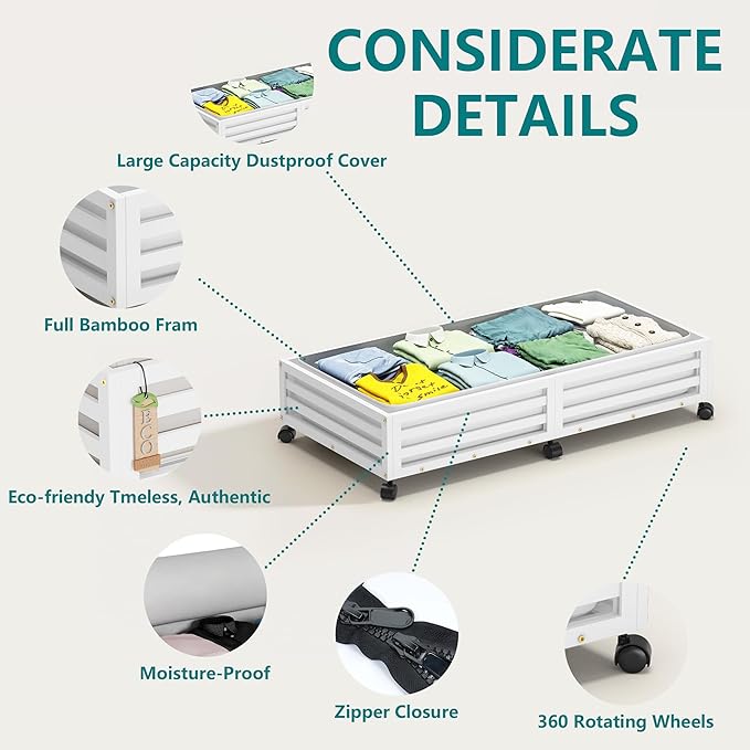 - ๐[Sturdy and Durable] Our under bed storage with wheels is crafted from premium wood bamboo, boasting 4 rotating wheels and a capacity of 120lbs. This 'under bed storage' solution includes non-woven bags for efficient organization of clothes, books, shoes, and toys.