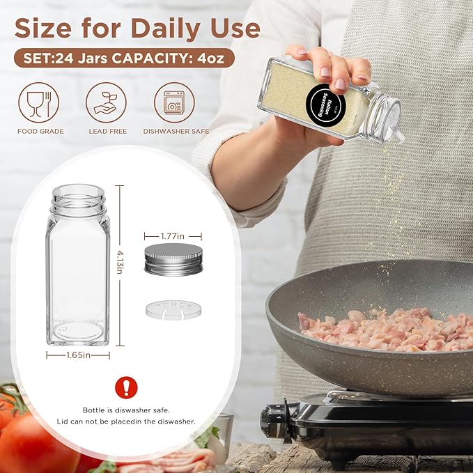 • 【Complete Spice Rack with Spice Jars Set】: This set of spice jars contains: 4 pack magnetic spice rack, 24 x 4oz glass spice jars with 4 sheets pre-printed labels and 1sheet blank label, 1 white pen , 1 silicone folding funnel (for refilling). All necessary accessories, in one box, no need to purchase separately. This set of seasoning containers with labels is the best choice for your kitchen.
