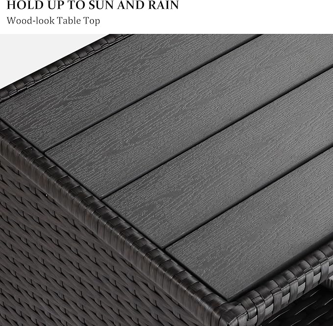 - Resin Faux Wood Top: Wicker Outdoor Bar Table with resin wood Tabletop, that mimics the look and feel of real wood.The resin wood top surface makes cleaning a cinch – a quick wipe with a damp cloth is all it takes. The sturdy steel frame of wicker storage cabinet that has been specially treated to withstand potential corrosion over time