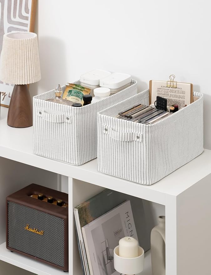 StorageWorks Narrow Storage Bins, Small Basket for Closet and Shelves, Rectangular Fabric Organizer with Handles, Toilet Paper Storage, Gray and White, 2-Pack
