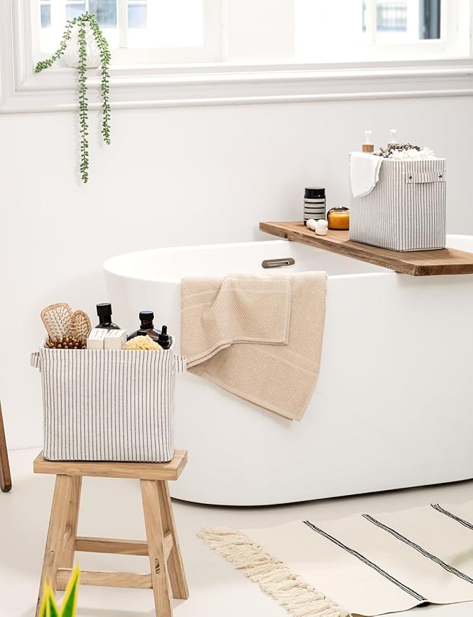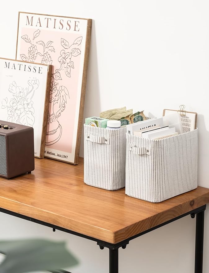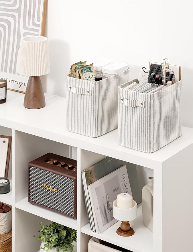 StorageWorks Narrow Storage Bins, Small Basket for Closet and Shelves, Rectangular Fabric Organizer with Handles, Toilet Paper Storage, Gray and White Stripes, 2-Pack